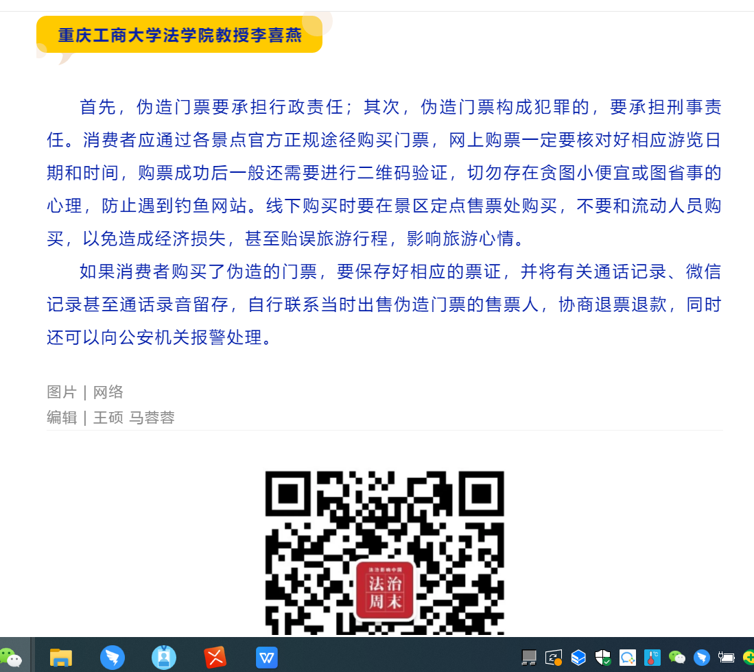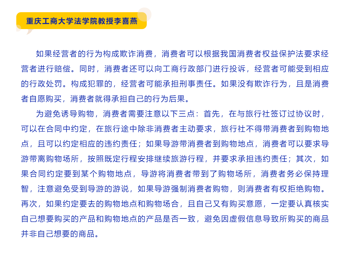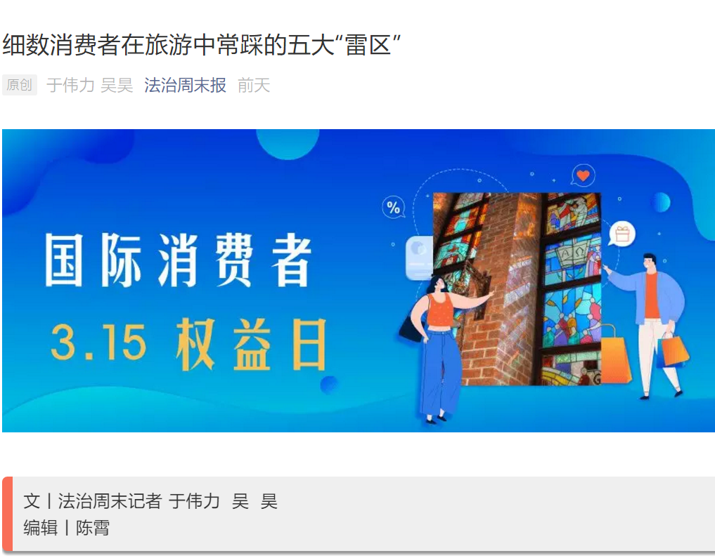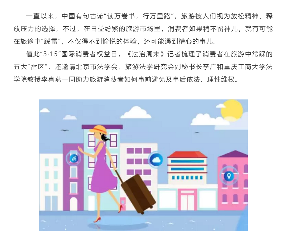 3月15日在国际消费者权益日到来之际,公司李喜燕教授接受法制日报法治周末版专题采访。采访中,李喜燕教授就消费者在旅游中常见的诱导购物和“黄牛”卖票等问题进行专题解答。