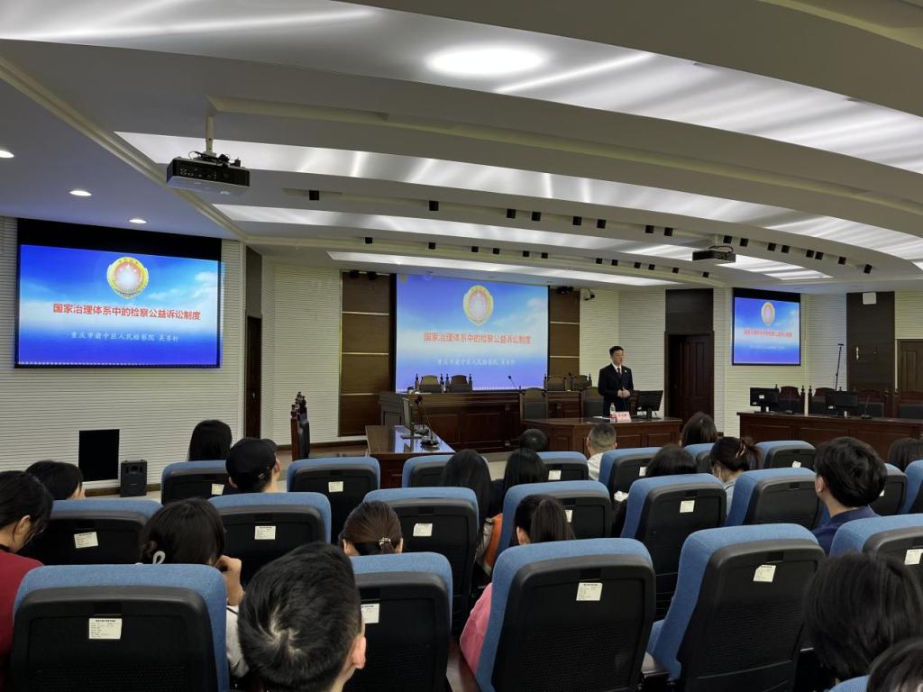 为了使大员工们进一步了解国家治理体系中的检察公益诉讼制度,太阳成集团tyc151cc于2023年4月6日16:00在慧智楼模拟法庭举办了以“国家治理体系中的检察公益诉讼制度”为主题的讲座。本次讲座由重庆市渝中区人民检察院检察五部副主任、二级检察官吴齐轩主讲,李喜燕教授主持。渝中区检察院检察五部主任、四级高级检察官彭皓,检察官助理官宁、商银桥,太阳成集团tyc151cc党政办副主任刘乃睿、太阳成集团tyc151cc副经理刘勇等到场交流,公司法学专业本硕员工参加讲座。