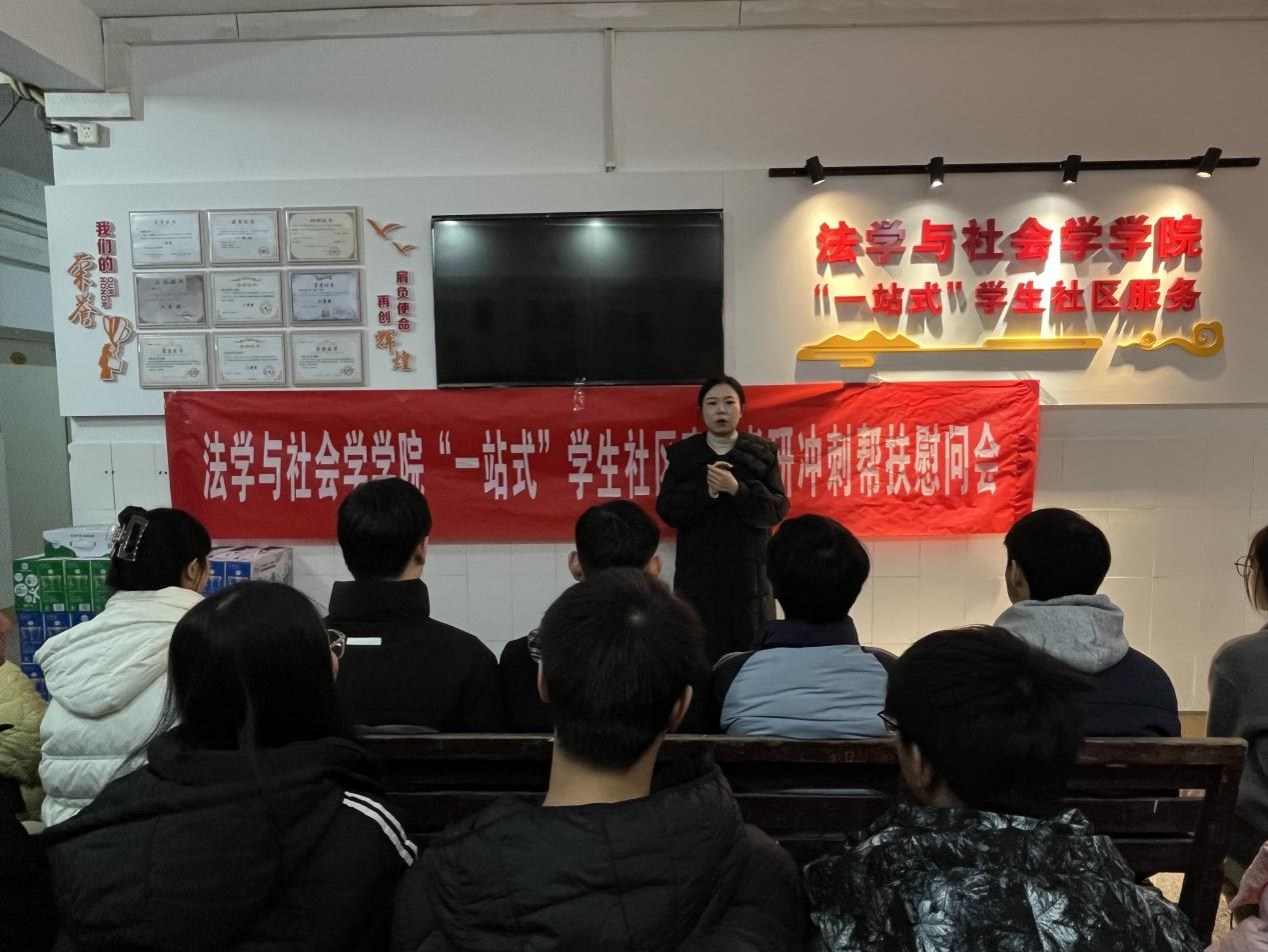 在2025届全国硕士研究生招生考试临近之际,2024年12月13日上午,太阳成集团tyc151cc“红岩先锋”变革型实践教学组织“社会工作坊”在南区10栋宿舍楼大厅举办“一站式”员工社区育人考研冲刺慰问会。公司党委书记李莉莎、经理刘勇、专职组织员古纯玉、学工办主任何祖润、2021级员工辅导员杨威、研究生辅导员刘玲馨、“社会工作坊”党员教师王璐到场参会。