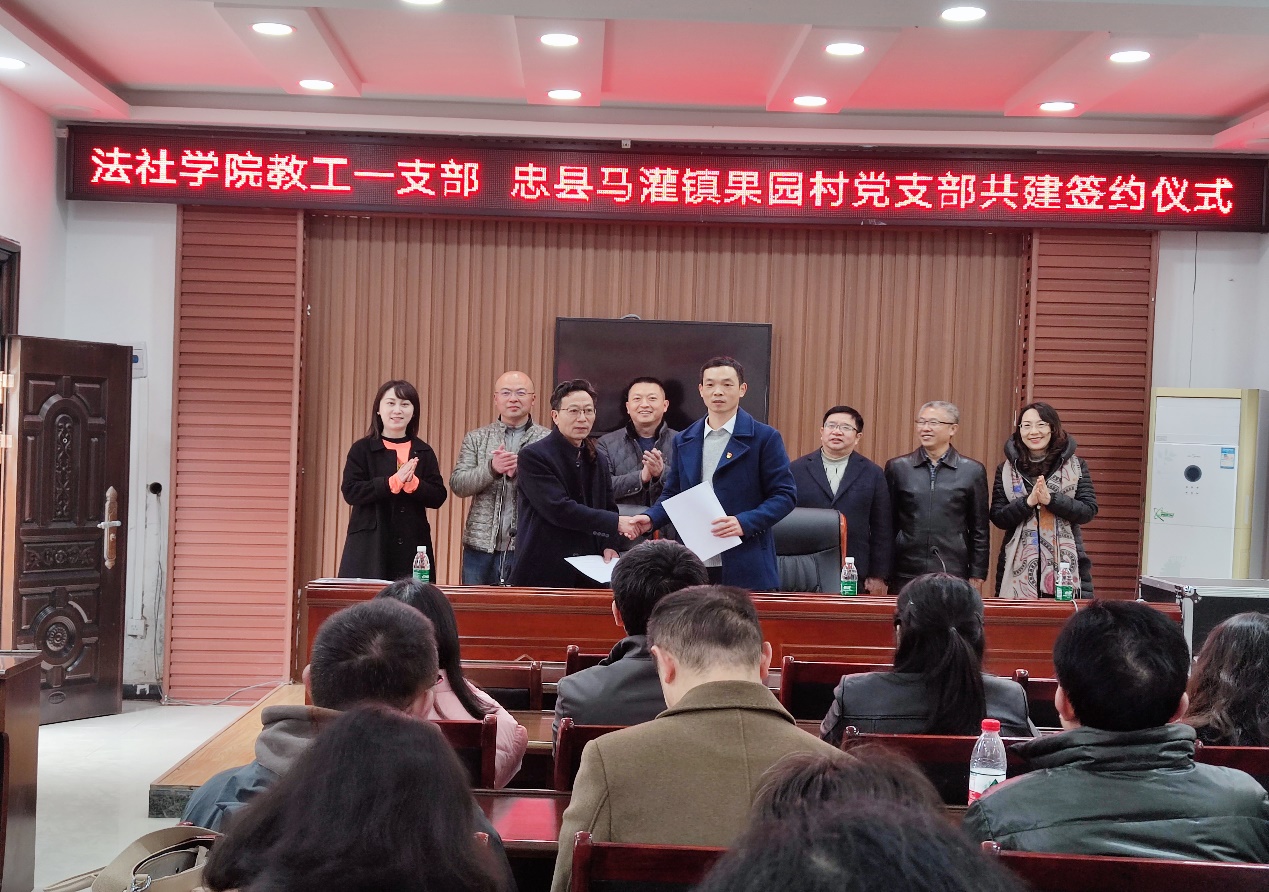 随后,法社公司教工一支部与马灌镇果园村党支部开展了支部共建签约仪式。会上,教工一支部书记焦海洋与果园村党支部书记刘斌就支部共建事宜达成了协议并完成了签约。