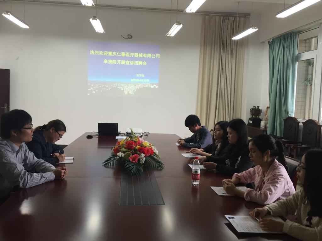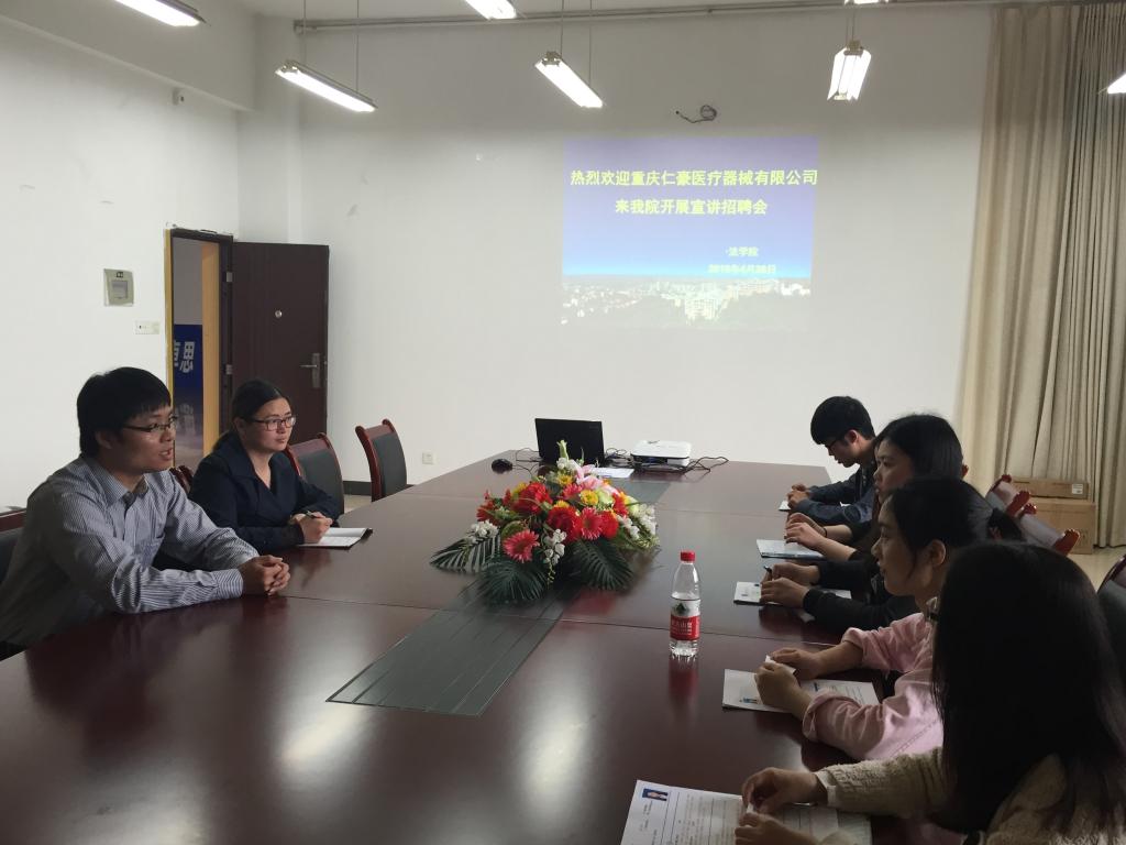 44月26日下午,重庆仁豪医疗有限公司莅临公司开展宣讲招聘会。该公司负责人周先生和易女士,法公司杨婷老师以及2012级部分毕业生参加了此次宣讲招聘会。