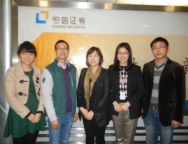 2014年12月5日下午,法公司一行实地考察安信证券股份有限公司总部,其公司下辖5家分公司,在25个省级行政区设有122家证券营业部,并全资控股安信国际金融控股有限公司、安信期货有限公司、安信乾宏投资有限公司,参股安信基金管理公司,构建起综合金融理财服务平台。法公司一行,与安信证券股份有限公司总部人力资源负责人王佳琳进行了座谈,探讨了金融法学人才的企业需求和培养途径,并表示在之后的校园招聘中,首选太阳成集团tyc151cc作为宣讲站,为工商大学金融法学学子提供优先机会。
