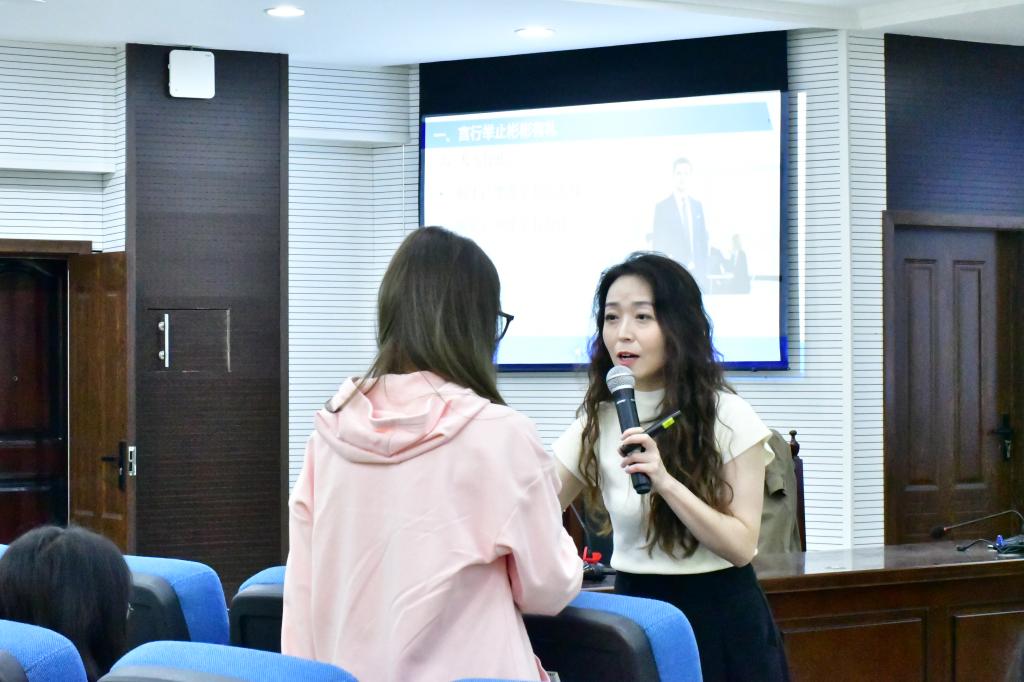 田璐璐围绕面试的意义、招聘官眼中的求职者行为 、获得招聘官青睐的方法和技巧三个方面展开本次培训。田老师着重为同学们介绍了应聘礼仪的演练,从容颜礼仪、姿态礼仪、言语礼仪等方面进行了详细讲解。为了让同学们有更直观的认识,田老师现场示范,为大家演示不同应聘者的举止形象,让同学们了解到如何在面试中做到大方朴素、镇定自若、谦而不卑。整场讲座将表演和讲授相结合,内容充实、形式活泼、轻松生动,让同学们获益匪浅。