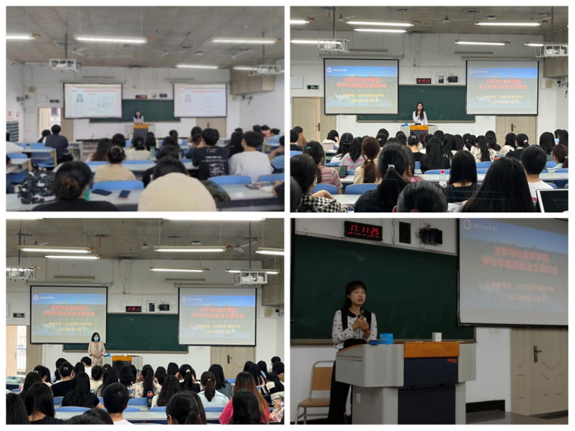 5月16日下午,2021级法学、知识产权专业员工参会。2019级知识产权专业员工徐英捷、谭渝昕,2019级法学专业朱桦溶、梁心然从考研、考公、法考、求职等方面为大家传经送宝。