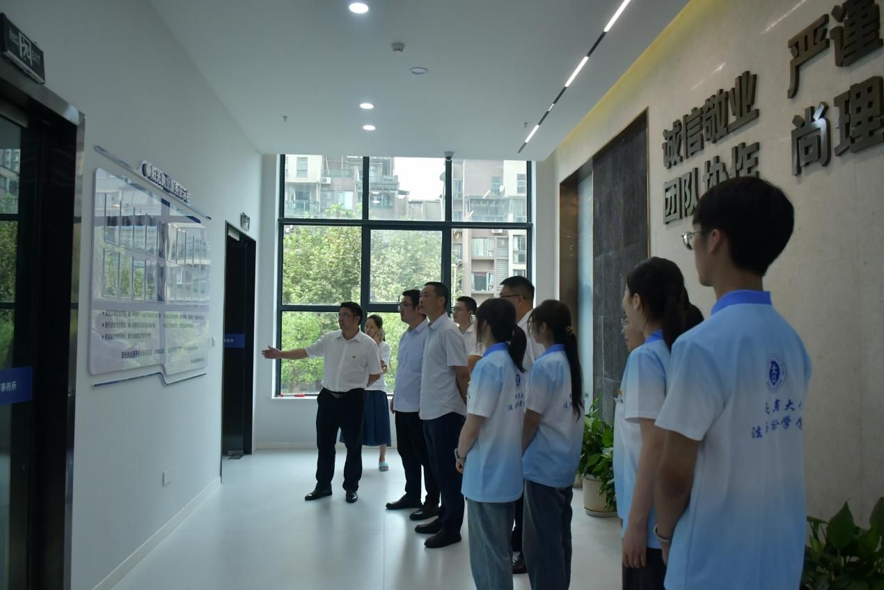 重庆渝潼律师事务所主任桂宝来带领师生团队全面参观了律所的办公区域,详细介绍了律师事务所的各项业务和工作流程。在座谈会上,双方进行了互动交流,律所主任桂宝来、副主任吴毅与师生团队交流普法经验,对老员工志愿者开展就业指导,帮助法学学子树立正确的就业观、择业观。