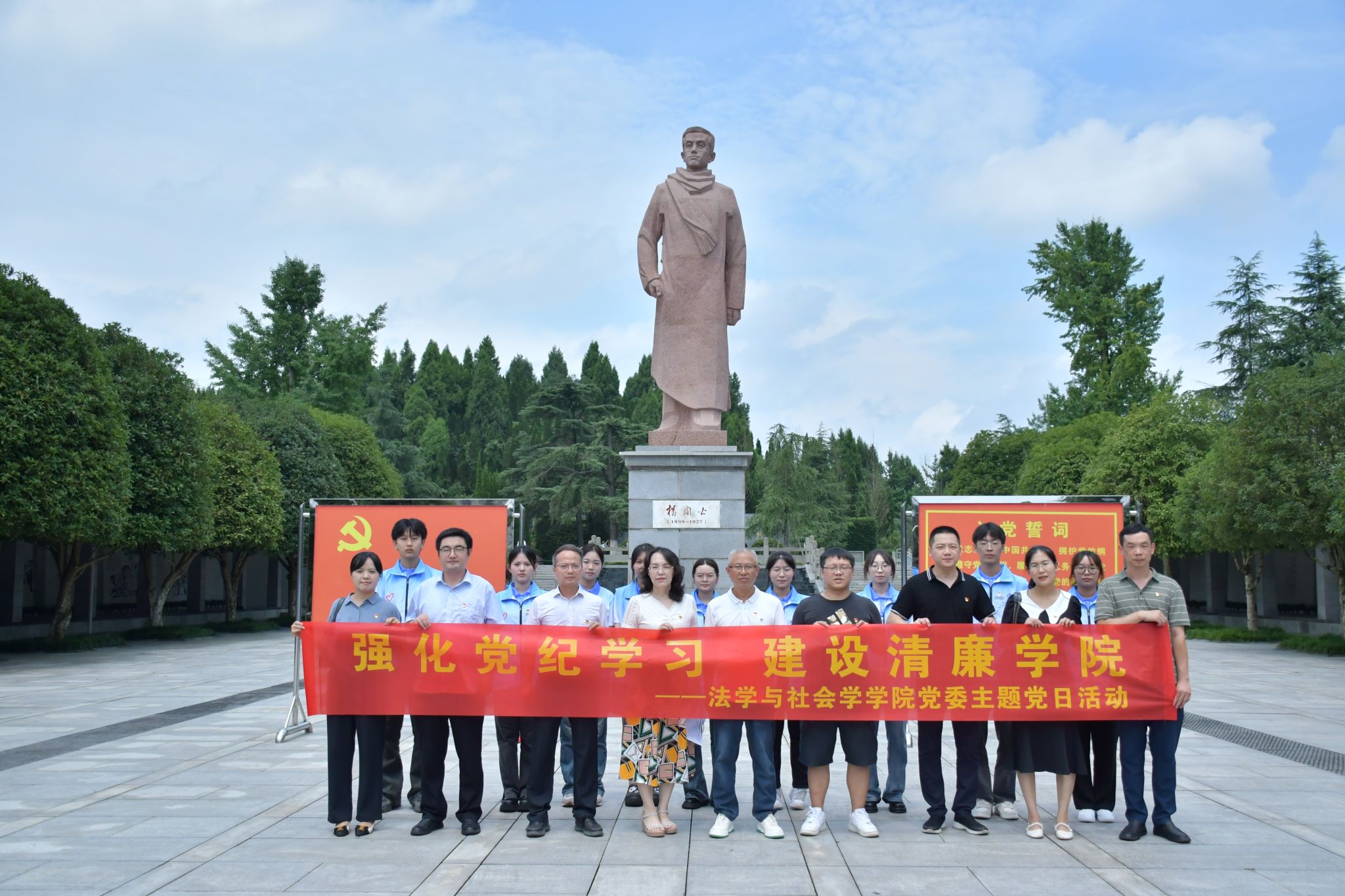 在杨闇公烈士陵园,李莉莎带领党员师生召开了党纪学习教育现场学习会。会上,陈善国介绍了杨闇公生平主要情况。李莉莎领学了杨闇公日记中关于党的组织纪律、廉洁纪律、群众纪律的论述。全体党员在李莉莎的带领下庄严宣誓,重温入党誓词。